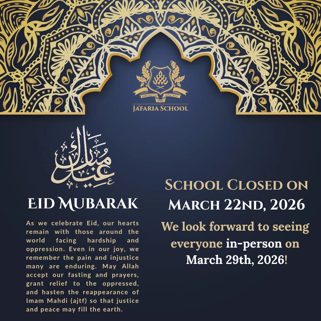 CLOSED For Winter Break Jafaria School will be CLOSED For Winter Break. Classes will NOT be held on Sunday December 28th, 2025 and Sunday January 4th,